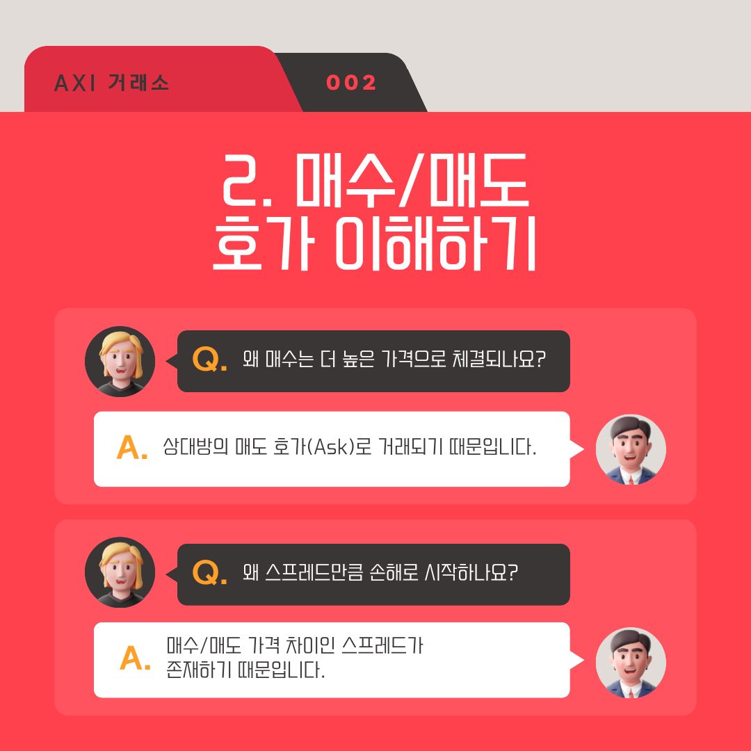 매수 | Ask (높은 금액) | 스프레드 만큼 손해로 시작 |