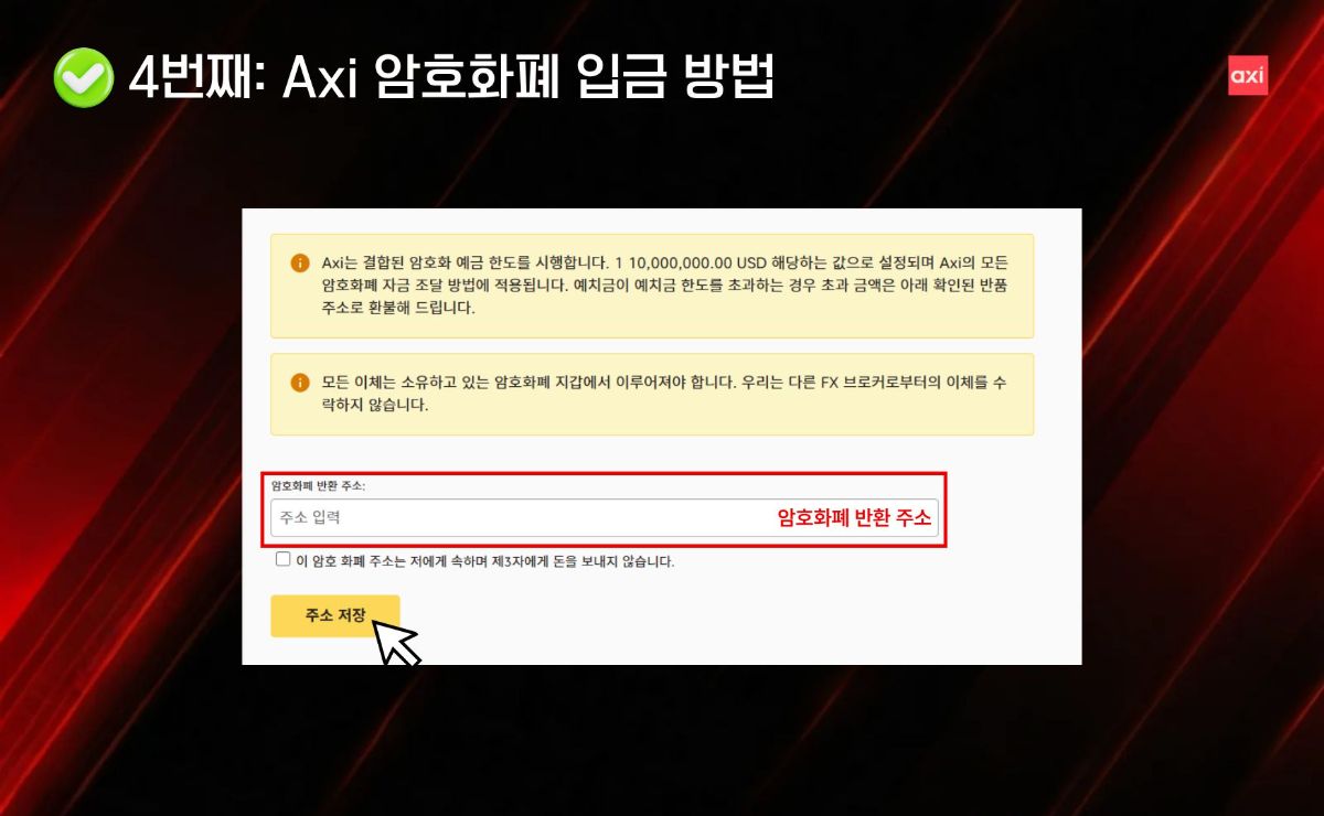 ⚠️주의점 잘못된 네트워크를 통해 송금한 자산은 Axi가 수령할 수 없으며 복구가 불가능합니다. |