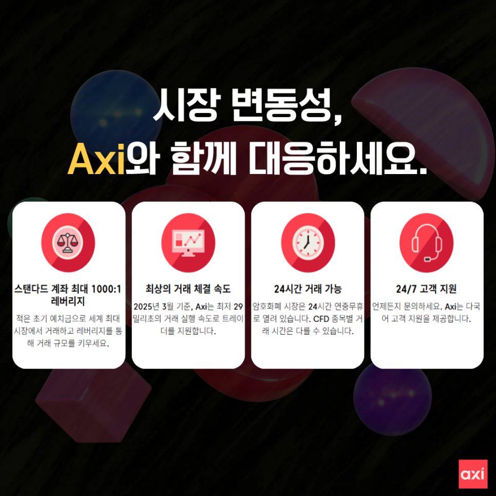 스프레드를 최소화하여 거래 비용을 줄이고자 한다면, AXI 계정을 통해 전략에 맞는 최적의 거래 환경을 경험할 수 있습니다.